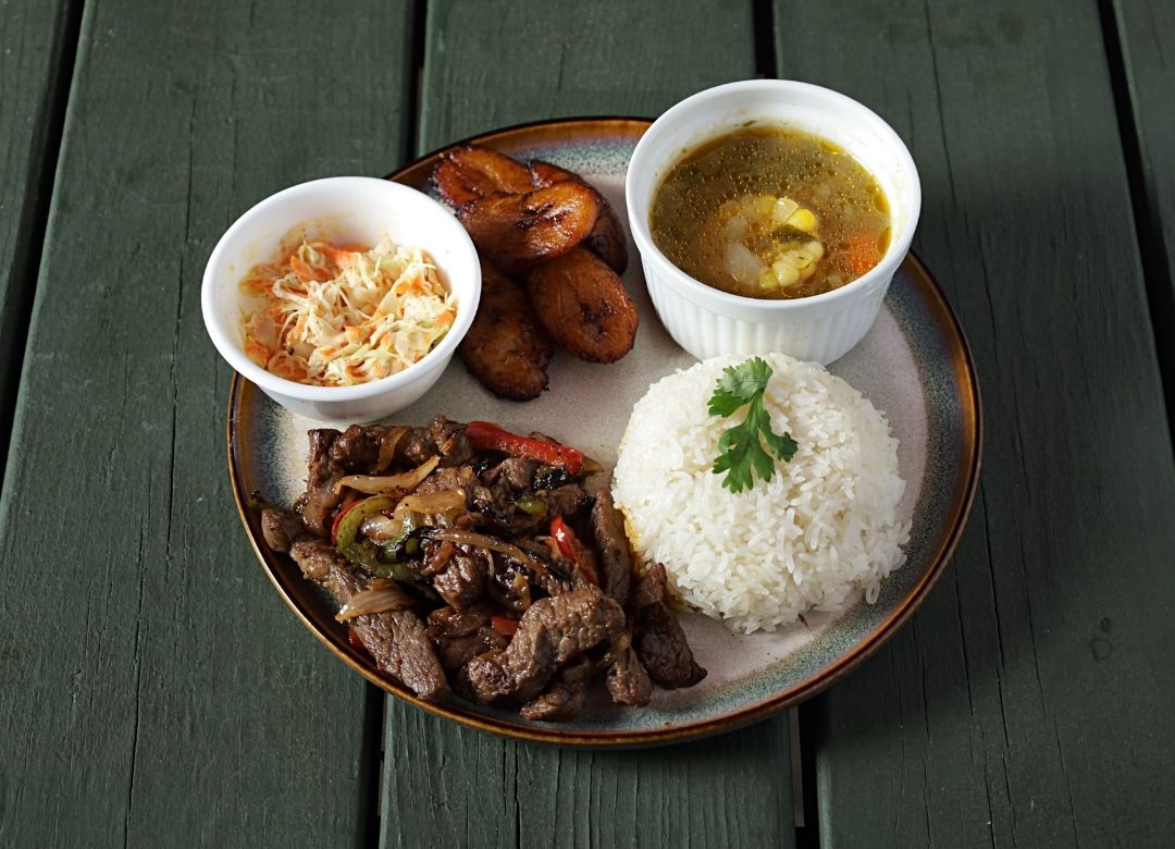 Beef fajitas, rice, raw salad, sweet plantains, chicken soup. - Fajitas de carne, arroz, ensalada cruda, plátano dulce, sopa de pollo.