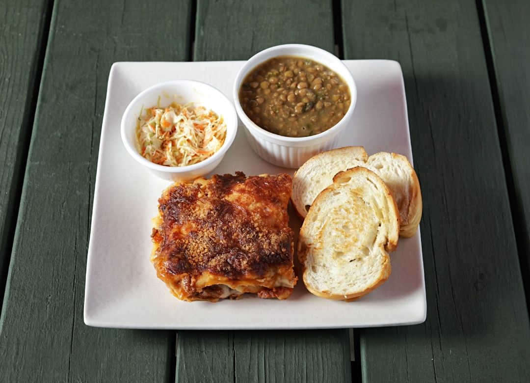 Lasagna, salad, toast, lentil soup./Pasticho, salad, pan tostado, sopa de lentejas.