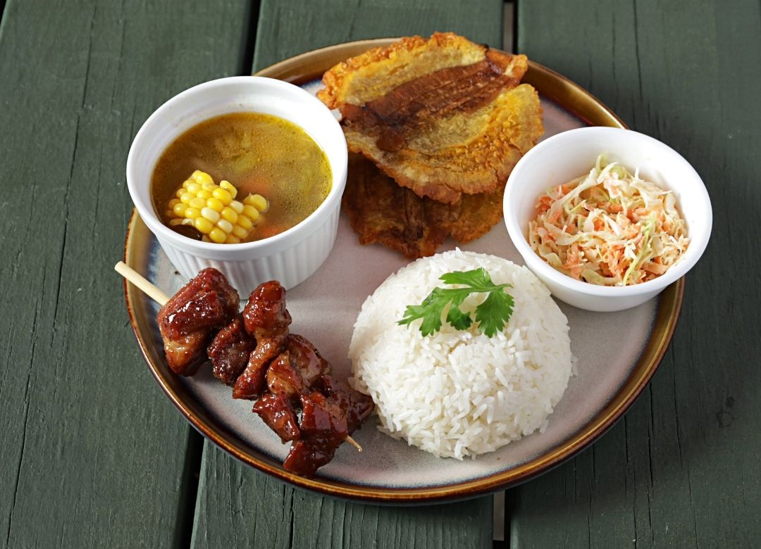 Pork skewer in pineapple sauce, rice, salad, fried plantains, chicken soup./ pincho de puerco en salsa de piña, arroz, tostones, sopa de pollo.