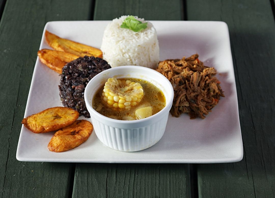 Shredded beef, rice, black beans, sweet plantains, chicken soup. - Carne mechada, arroz, frijoles negro, plátano dulce, sopa de pollo.