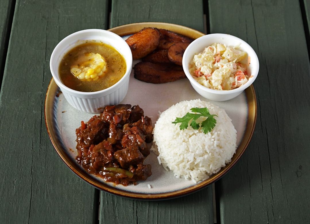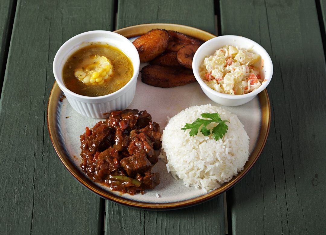 Stewed meat, rice, salad, sweet plantain, chicken soup. - Carne guisada, arroz, ensalada, plátano dulce, sopa de pollo.