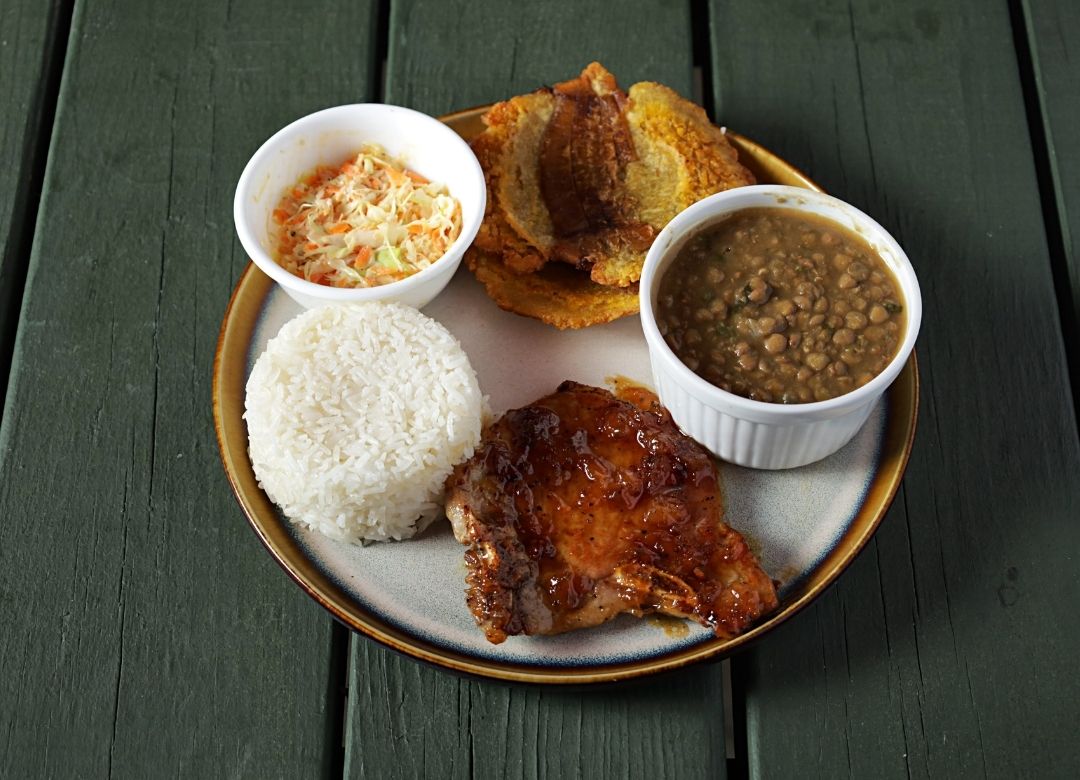 Pork chop in pineapple sauce, rice, fried plantains, lentil soup, and a raw salad. - Chela de puerco en salsa de piña, Arroz, tostones, sopa de lentejas, ensalada cruda.