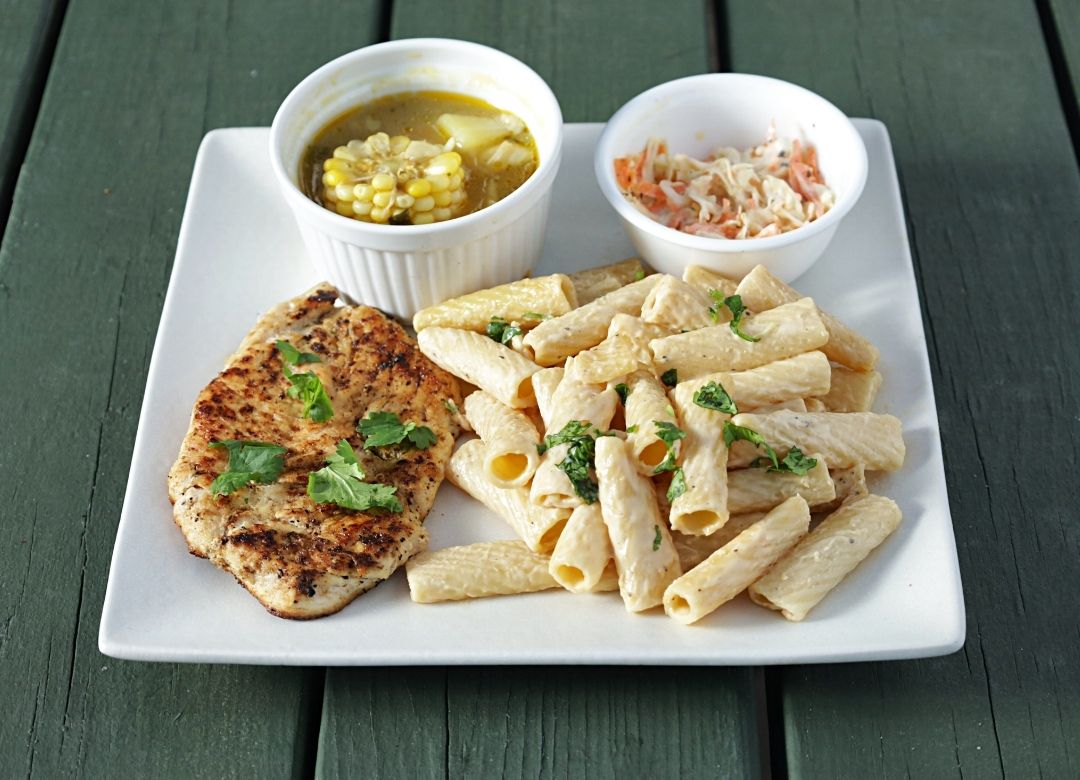 Grilled chicken fillet, Alfredo pasta, salad, chicken soup. - pechuga de pollo a la plancha, pasta corta Alfredo, ensalada, sopa de pollo.