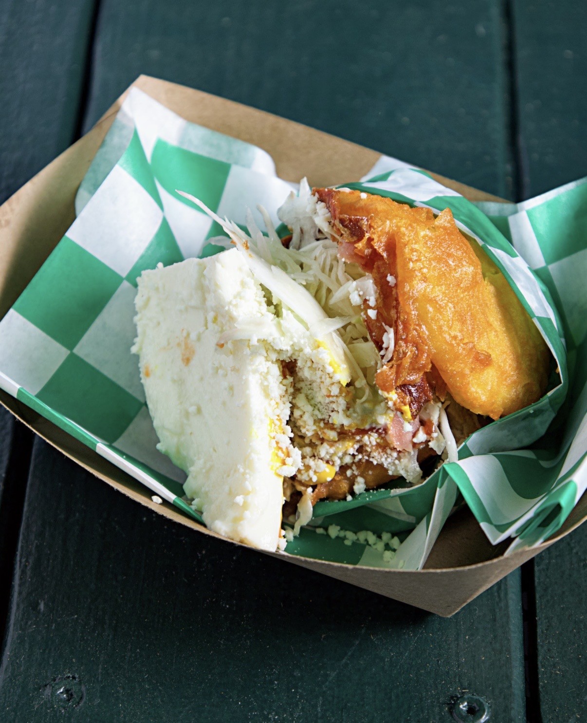 X2 Fried cheese, cabbage, tartar sauce, ketchup, mustard. - X2: Queso frito, repollo, salsa tártara, ketchup, mostaza. -