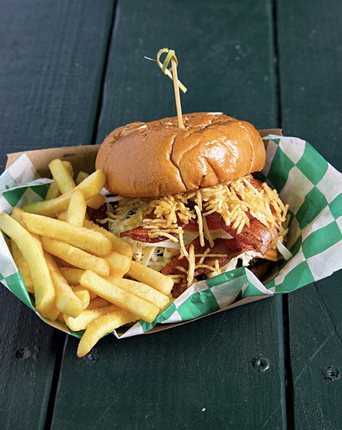 Choice of protein, chease, bacon, lettuce, potatos sticks, tomatoes, onions, green sauce, ketchup, mustard, French fries- Elección de proteína, queso, tocineta, lechuga, tomate, cebolla, papitas, salsa verde, salsa de tomate, mostaza, papas fritas