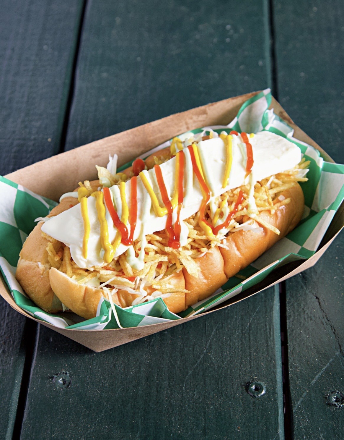 Mortadella, cabbage, green sauce, ketchup, mustard, and cheese - Mortadela, repollo, salsa verde, ketchup, mostaza y queso -